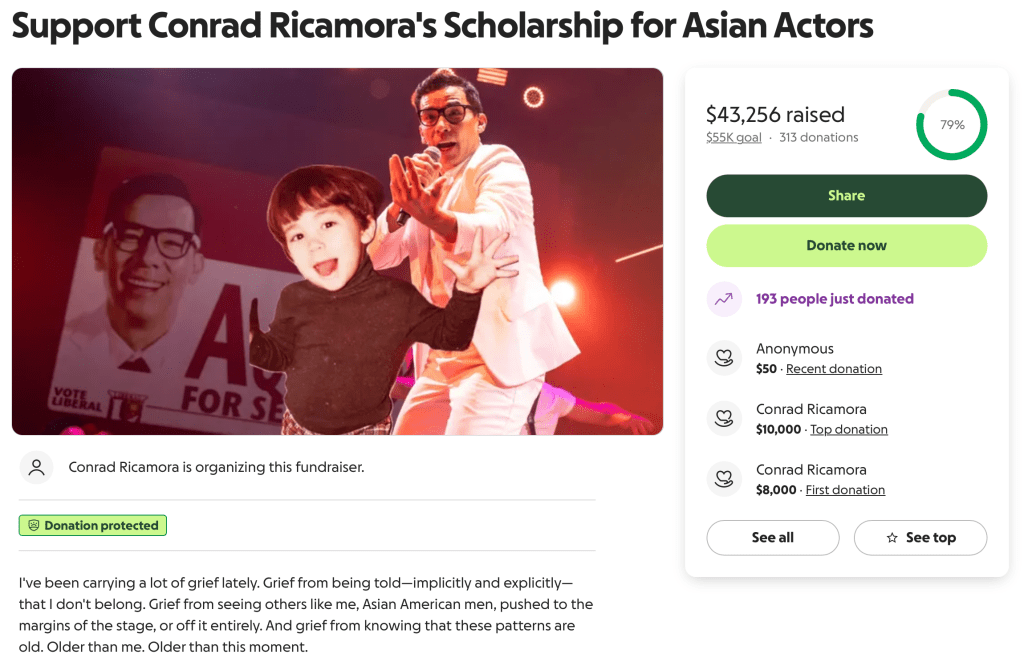 Ricamora has launched a GoFundMe campaign to raise money for a scholarship for Asian American male actors pursuing BFA or MFA acting degrees—to help plant seeds of hope for the next generation.